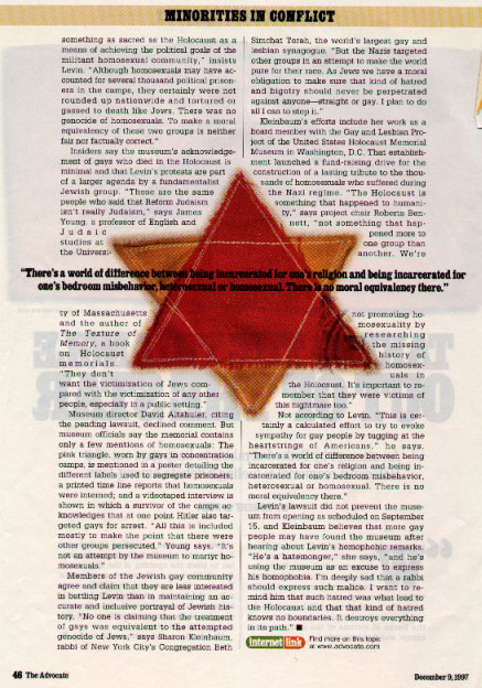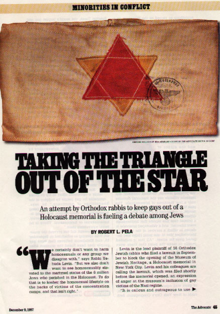 The new museum in Battery Park City called the Museum of Jewish Heritage - A Living Memorial to the Holocaust is now being sued by 18 rabbis and 2 Roman Catholics. They are trying to prevent the opening from occuring. They are upset that some exhibits include that there were homosexual victims. This chart and along with a time line is what the complainants are upset about. It was reported in Jewish Week that "David Zweibel, general counsel for Agudath Israel of America called the lawsuit's claims somewhere between baffling and highly offensive, and said it does not reflect the consensus of the Orthodox community." We have sent a letter of support and I gave an interview to the National Public Radio station on this topic. Rabbi Yehudah Levin has a problem in commemorating the value of people who "misbehaved" in bed, as he put it, along with the people who died in the name of G-d. The magazine "The Advocate" has devoted a feature article to this issue called "The Triangle is Taken Out of the Star". It is in the December 1997 issue... Or read it yourself...
