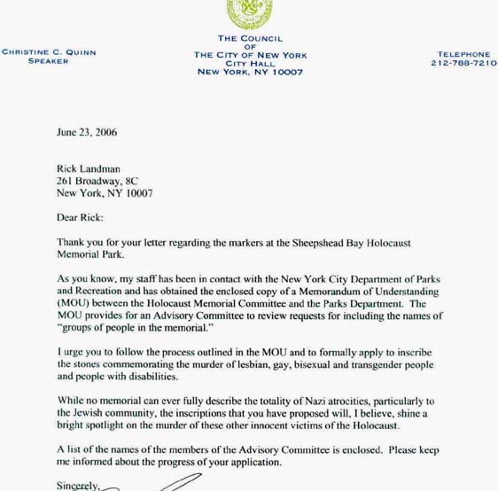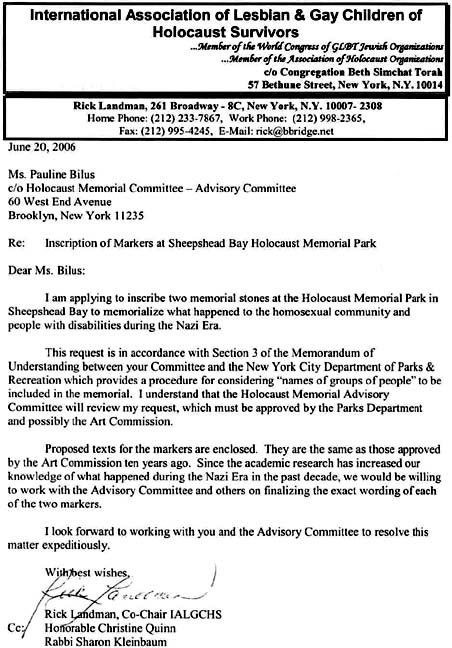 THE FOLLOWING PEOPLE UNVEILED THE FIVE MARKERS FOR THE OTHER VICTIMS Dr. Magnus Hirschfeld's Institute of Sexual Science, and the related Berlin Students' Book Burning Bonfires. ![]() Map of NYC Holocaust Memorial Park at Sheepshead Bay. Closest Subway stop is Sheepshead Bay on the "B" or "Q" lines. It is about a 10-15 minute walk from the subway to the Park. The following are photos of the 5 Stone Markers and some pictures of the Memorial Park and of the workers who helped complete this project on July 25, 2012. ![]() NYC's Sheepshead Bay Holocaust Memorial Park Sign ![]() Rick Landman standing next to the Homosexual Marker ![]() Central Statue of the Park which includes that the Memorial is dedicated to all the other victims too ![]() Wide view of many of the hundreds of other markers ![]() Supreme Memorial Staff volunteering their efforts to complete this project ![]() Showing how the staff inscribed the stone markers ![]() Marker Dedicated to the Homosexual Victims ![]() Marker Dedicated to the Gypsies, Roma, Sinti Communities ![]() Marker Dedicated to the Disabled Community ![]() Marker Dedicated to the Jehovah Witnesses ![]() Marker Dedicated to the A-Socials (Homeless) and Political Victims THE CITY OF NEW YORK ISSUED A PERMIT FOR THE INSCRIPTION OF THE 5 STONE MARKERS IN 2010 REMEMBERING THE OTHER VICTIMS OF THE NAZI ERA AT THE CITY'S SHEEPSHEAD BAY HOLOCAUST MEMORIAL PARK WHICH WERE FINALLY INSCRIBED ON JULY 25, 2012. @ Emmons Avenue and Shore Boulevard In 1996, The International Association of Lesbian and Gay Children of Holocaust Survivors, and Congregation Beit Simchat Torah were the applicants requesting that 5 stone Markers be inscribed telling what happened to the Other Victims of the Nazi era. The stone markers for the Other Victims were part of the originally approved concept for the Holocaust Memorial Park in the early 1990's, but were never inscribed at the time. Actually, ten stones were reserved and ten texts were submitted to the Arts Commission for the Other Victims. We consolidated a few into the 5 markers. But if other groups want their stories told, they should contact the Holocaust Memorial Committee. The main Memorial in the center states that the Park is dedicated to "the 5 million other innocent human beings who were also murdered under German rule during World War II". So finally, their stories will be explained and a deeper understanding of our history will be told. Year after year our application was denied by the local Committee; but the application was finally approved by the NYC in 2010. Many people didn't realize that this is actually city owned land and not privately owned property. In 2010, there were some demonstrations by a few vocal groups still objecting to inscriptions (see articles below). But today we finally completed this City Memorial that was always dedicated to all of the Victims of the Nazi era by expanding the information of what happened from 1933-1945. We thank Frank, Joe and Michael Cassara (and Jack Desilets) of Supreme Memorials, who at their expense, inscribed all five markers in the Holocaust Memorial Park. "As one of the applicants to memorialize the Other Victims, I feel we increased the educational component of this City Memorial, while learning an important lesson from the Holocaust. Namely, others who was murdered by the Nazis have a right to be remembered, memorialized with their stories being told. The full extent of the Nazi atrocities can only be seen by viewing how their ideology of dehumanizing and killing many others furthered their ability to try to exterminate all the Jews. First they killed or arrested political opponents, the disabled and homosexuals etc. years before they perfected their the Final Solution. " 7/25/2012 Rick Landman, Co-chair of the International Association of Lesbian and Gay Children of Holocaust Survivors. "It's important that we remember everyone who was murdered by the Nazis. No only did the Nazis slaughter millions of Jews, they persecuted gays and lesbians, disabled people, political prisoners, Gypsies and other minority groups. In the Nazi era, discrimination led to the death of millions; we must fight discrimination in all forms so that this doesn�t happen to a minority group ever again." Rabbi Sharon Kleinbaum, CBST, Congregation Beit Simchat Torah LEGAL STATUS AND HISTORY Even though the local Committee was given a Memorandum of Understanding to be able to follow guidelines for the inscription of names on the stone markers; the ultimate decision making powers always remained with the Mayor (or Park Commissioner). The City Charter does not allow the ultimate decision-making to be delegated to the local community group. Remember, the Holocaust Memorial Park is a city owned park; not privately owned property. So after the local Committee rejected the request for the inscriptions for the Other Victims for years, the City created an appeal process. A Blue Ribbon Panel was created from representatives of Holocaust Museums etc., and they reviewed the application and approved it. The final approval came from the Parks Commissioner and Mayor. Please scroll down the page to read about the 16 year history of this endeavor, including the newspapers articles, requests and applications, and approved text for each of the 5 Markers. As of April 11, 2010