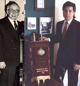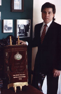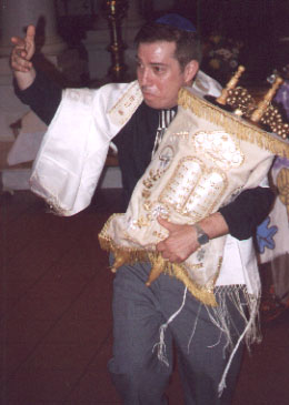 by Rick Landman The Torah Returns to Munich's Congregation Beth Shalom in 2004![]() From left to the right: Maria Drach, Board member of BS, Adrian Michael Schell, Board member of BS, Fred Fischer, Jan Muehlstein, In front of the Parochet that used to hang in Beth Hillel, New York City during the 1940's - 1970's. In the 1950's, the "Little Torah" was kept behind this Parochet at Beth Hillel. Martin Oettinger took Rick Landman as a child to pray at Beth Hillel and both would have davened. ![]() The Processional in Munich with Rick Landman carrying the Little Torah. ![]() Photo collage of Martin Oettinger and Rick Landman surrounding the Torah The following story describes how the Torah formerly housed in New York City, came from Germany in 1946 and returned to German soil on November 14, 2004. The Torah left Congregation Beit Simchat Torah on Kristallnacht and was donated to the World Union for Progressive Judaism and loaned to Congregation Beth Shalom (formerly located at Isartalstrasse 44A) in Munich Germany. This story ties together both sides of my family. The Torah was given to me by Martin Oettinger, my mother's father (who brought the Torah to America in 1946) and it will go to a synagogue in Munich, the city from where my father's grandparents were deported to their death in the Holocaust. That is why the Torah is being dedicated in the memory of both Martin and Elsie Oettinger as well as Gerson and Sofie Landmann. Martin Oettinger, standing next to a different Torah. Martin brought three Torahs to America. One has already returned to Erlangen, Germany and another is in California and this one is now in Munich Germany.